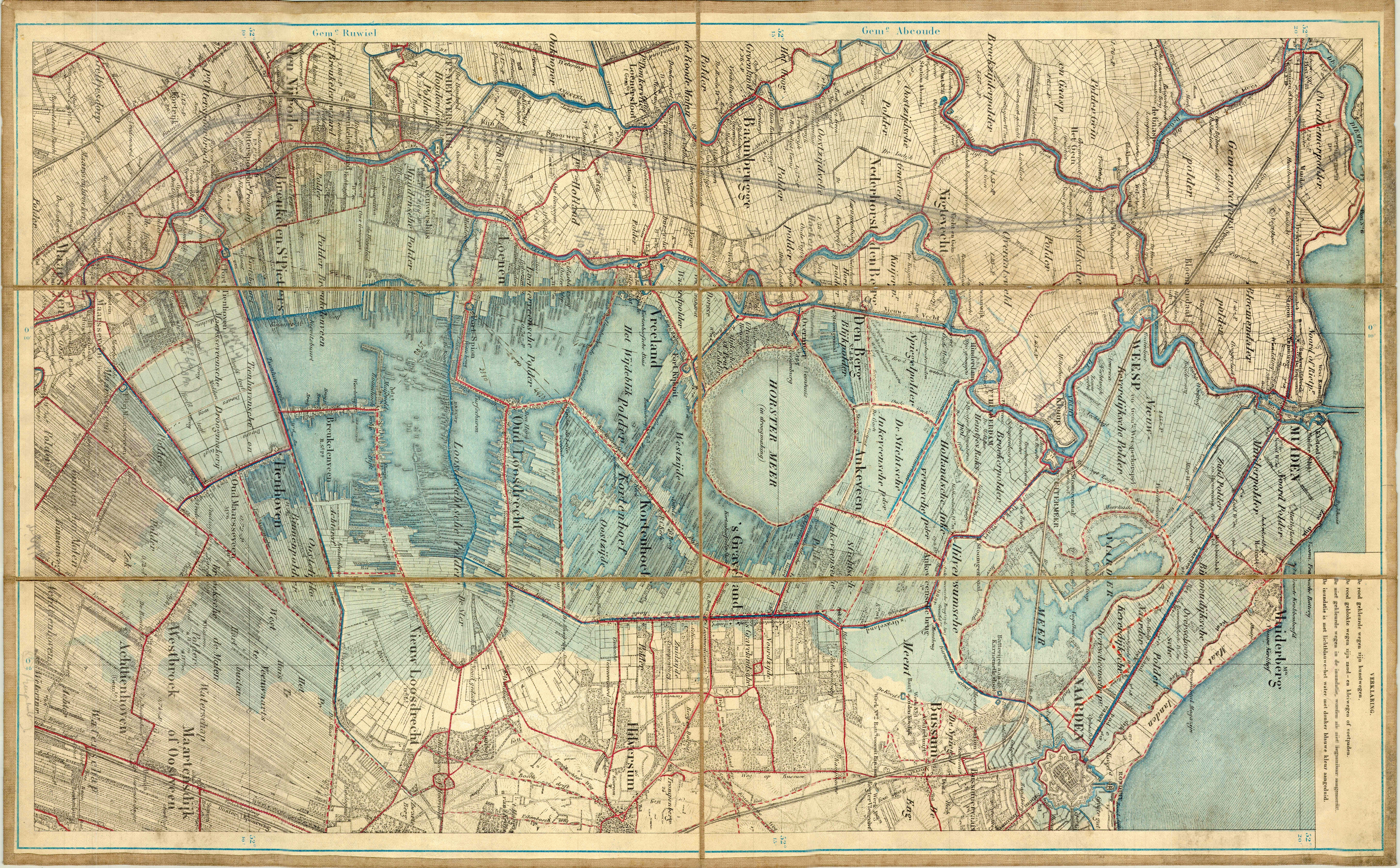 Een tweede kaart staat hieronder, het betreft: een kaart voor de "Manoeuvres in het Noordelijk deel der Nieuwe Hollandsche Waterlinie 1883". De kaart heeft een schaal van 1:50000. Die heb ik als gehele kaart laten scannen. Te downloaden, ruim 14 mb. |