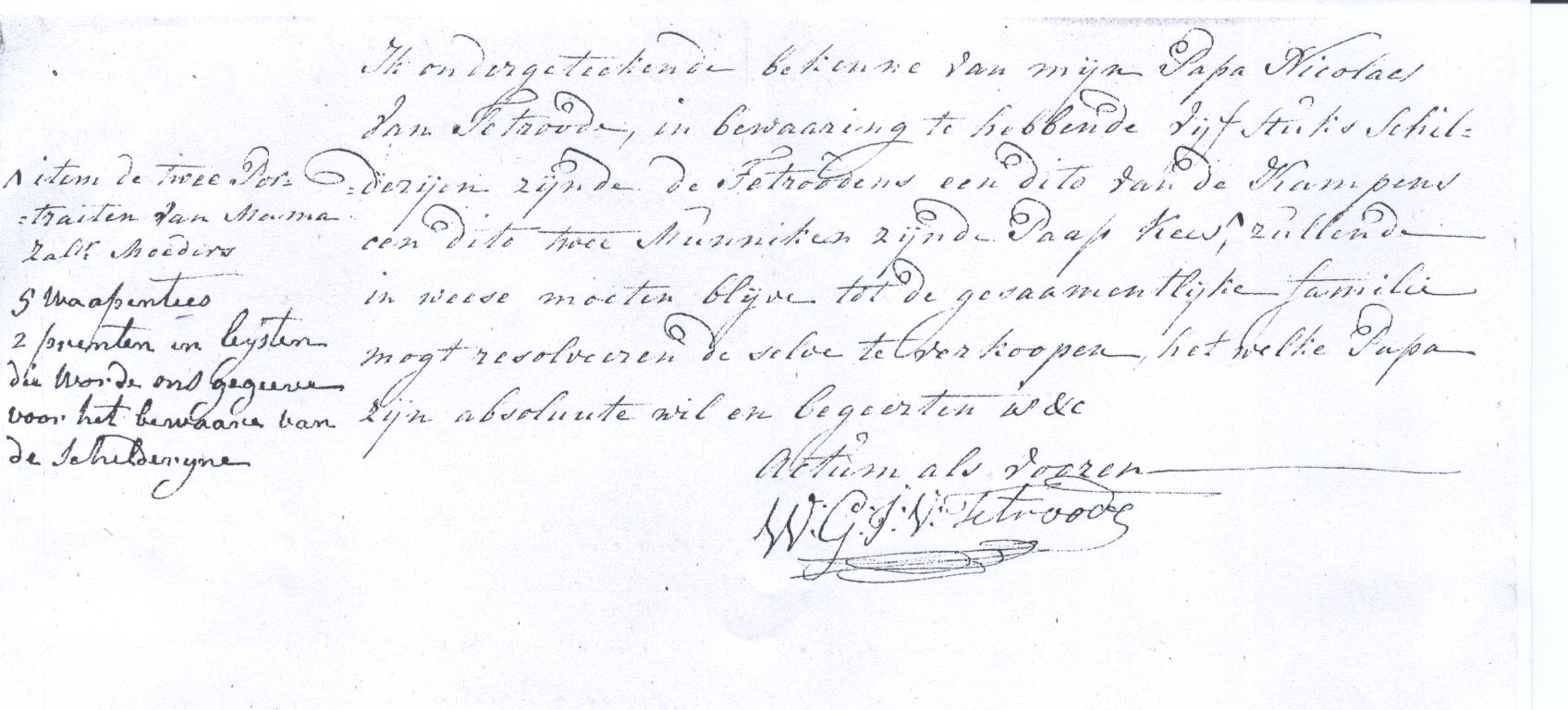 In 1782 heeft hij aan zijn zoon Wilhelmus Gijsbertus Joannes zijn papieren betreffende zijn bezittingen in bewaring gegeven. Daarvan heeft Wilhelmus een inventaris gemaakt. Het gaat o.a. om 12 stukken land, een huis, diverse lijfrentes en obligaties. Sommige obligaties behoren anderen toe en Wilhelmus belooft dat hij deze te allen tijde zal restitueren.