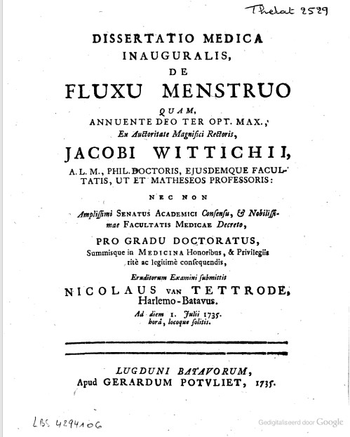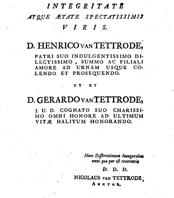 Nicolaus bezocht de Latijnse School in Haarlem. Hij is daar ingeschreven op 29 april 1721 met daarbij de mededeling: “oud 10 jaar”.  Dit strookt niet helemaal met de mededeling van zijn oudste zoon. Maar kennelijk wilde Hendrick zijn zoon zo snel mogelijk op de Latijnse school hebben.  Daarna ging Nicolaus in Leiden geneeskunde studeren. Hij promoveerde op 1 juli 1735 in Leiden tot Doctor in de geneeskunde op het  proefschrift “de FLUXU MENSTRUO”,  over de menstruatie dus. Het is in het latijn. Het proefschrift is nog aanwezig in Leiden. Bij zijn promotie zijn twee paranimfen: de ene is zijn vader (Patri Suo) : Henrico van Tettrode en de ander is Mr. Gerardo van Tettrode.  De namen zijn ook “verlatijnst”. Gerardo wordt daarbij omschreven als een “Cognato”, wat zowel “verwant” als “bekende” kan betekenen. Op de aanvullende pagina over Mr. Gerard Van Tetrode heb ik de relatie tussen Nicolaus en Gerardo uitgewerkt. Gerardo is de achterneef van zijn vader Henrico. Mr. Gerard van Tettrode was jurist en advocaat te Haarlem. De gegevens die ik over deze Mr. Gerard van Tettrode heb verzameld, heb ik bij de aanvullingen op een aparte pagina gezet. Mr. Gerard van Tetrode