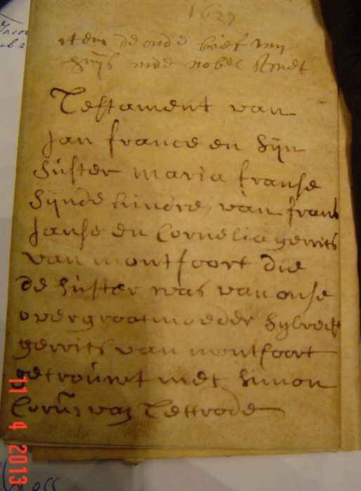 “Testament van jan franse en zijn suster maria franse sijnde kindere van frans franse en cornelia gerritsd van montfoort die de suster was van onse overgrootmoeder syburcht gerritsd van montfoort getrouwt met simon corn van tettrode”