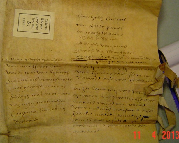 “huwelijks contract van Pieter Harmansz en Machteld Daems   1513 10 maart   geseegelt van Jacob Gerritsd van Montfoort geweest hebbende de broeder van Syburg Gerritsd van Montfoort die huijsvrou was van Sijmon Cornelisse van Tetrood onse overgrootouders en het komt mij voor dat dit extract is de huwelijkse voorwaarde van de oom van de voornoemde montfoorde alsook haar live moeder Jannetje Harms ……. Het is ook met de datum overeen te brengen. “