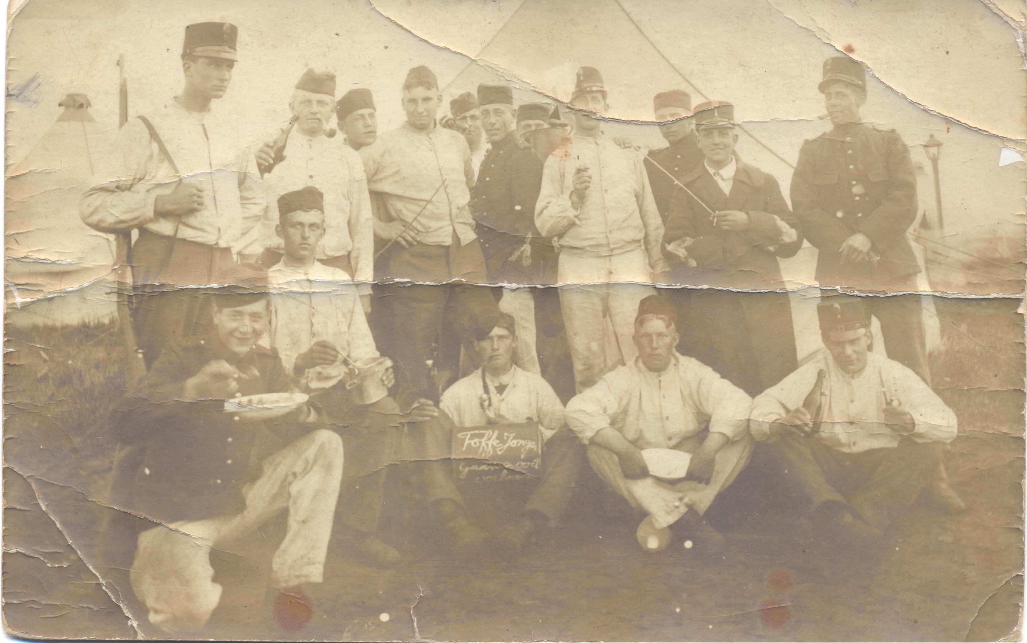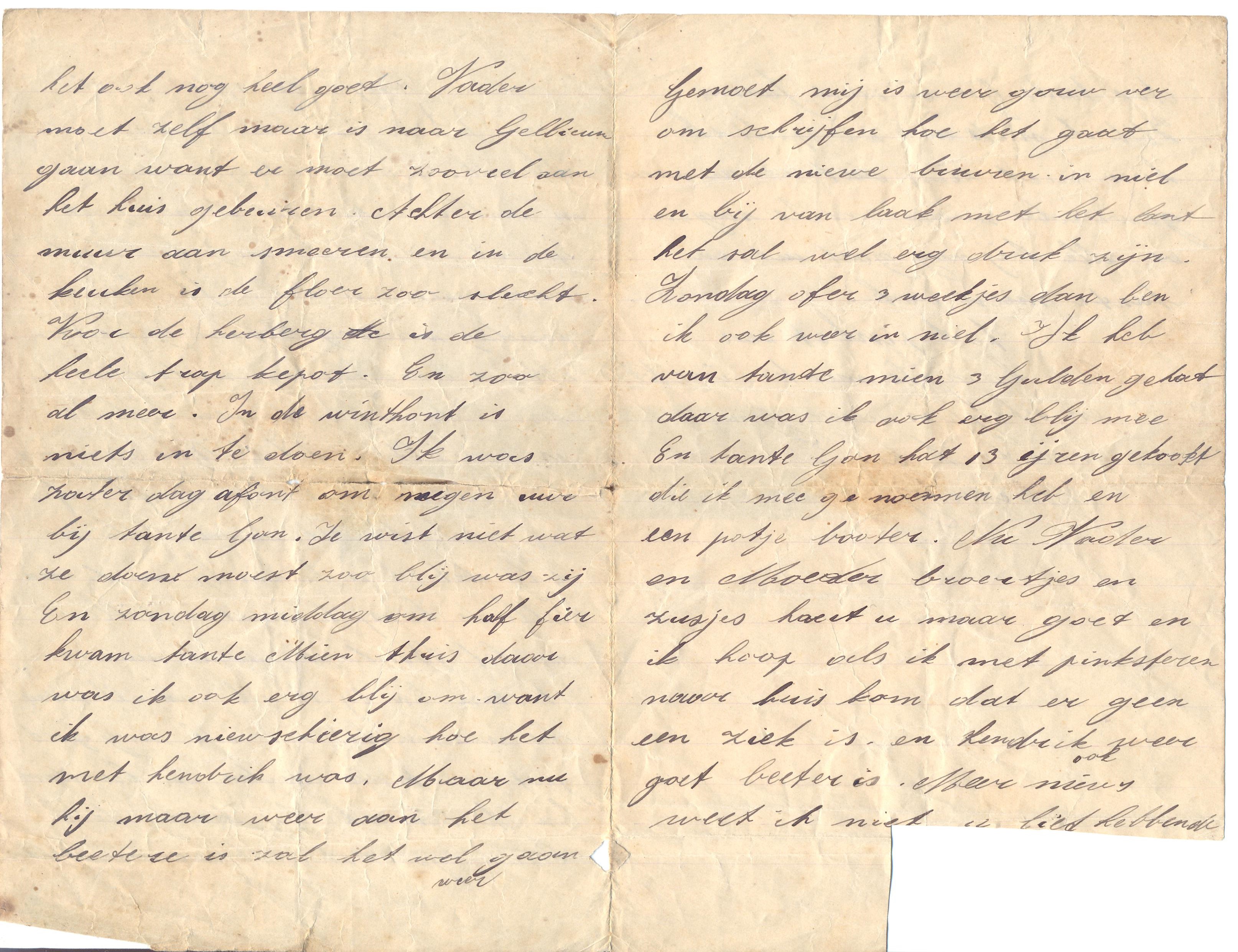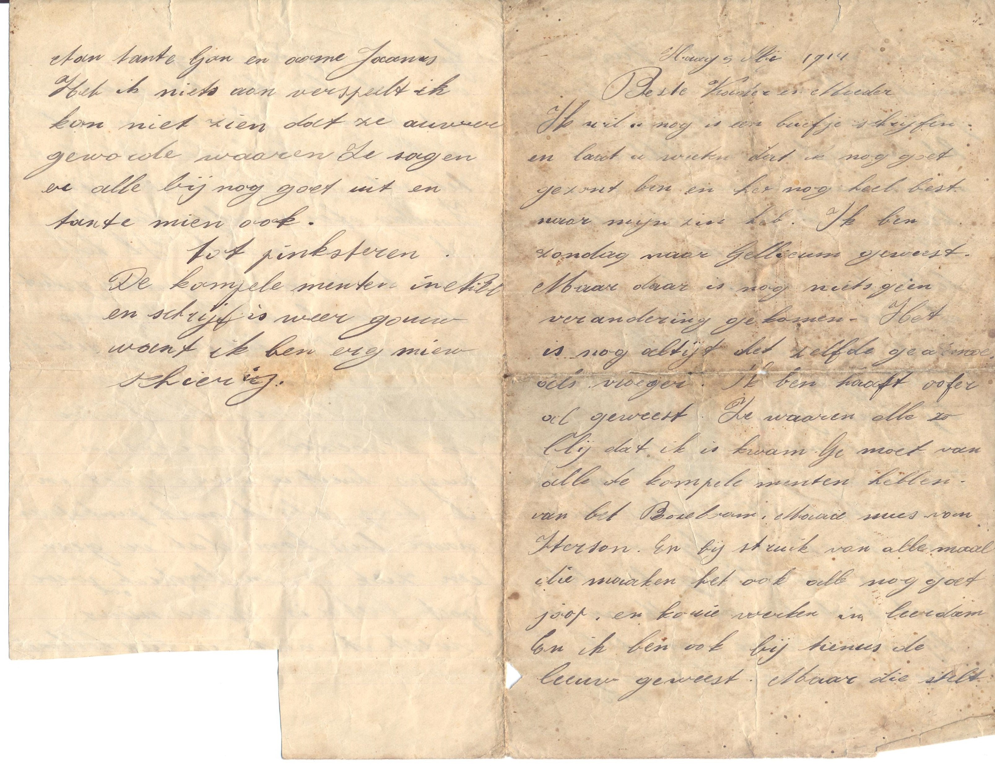 Herbertus Johannes Versteegh (Herbert) Herbert was de oudste zoon en is met beide voornamen genoemd naar zijn vader. Hij is geboren op 11 febr. 1894 in Gellicum. Op 20 jarige leeftijd is hij overleden in militaire dienst op 15 augustus 1914 in het militair hospitaal in 's-Gravenhage en is daar begraven op 18 augustus op het R.K. kerkhof. Begin januari 1914 is hij in dienst gegaan. Volgens mijn vader, Koos Versteegh, is hij gestorven aan een longontsteking. In die tijd woonde de familie Versteegh niet in Gellicum maar in Niel, in Duitsland, net over de grens bij Millingen aan de Rijn. Af en toe mochten de militairen met verlof en dan ging hij meestal naar zijn oom en tante in Gellicum. Ook is hij nog minstens twee keer in Niel terug geweest. Herbert was zo lang dat alle militaire kleding hem te klein was. Alles moest voor hem apart gemaakt worden. Na een maand liep hij nog in burgerkleding en klaagde hij erover dat alles aan het verslijten was. Hij schreef vanuit Den Haag enkele brieven naar huis. Die zijn bewaard gebleven. Een kopie van een van de brieven staat hieronder. Je kunt beginnen te lezen bij het donkere gedeelte op de eerste scan en eindigen op het linker gedeelte van de eerste scan. (Klik voor vergroting) Hierboven een foto van Herbert en zijn kompanen in militaire dienst.