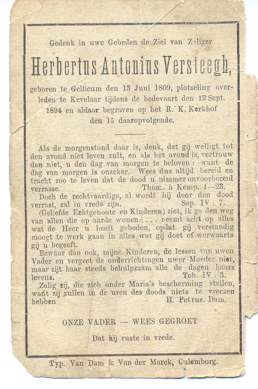 Herbert Antonie Versteegh (13-06-1809 - 12-09-1894) Zijn vader Willem overleed in 1817 (de precieze datum is niet bekend). Herbert was toen 8 jaar en had nog een jonger zusje en twee nog kleinere broertjes. Zijn moeder, Alegonda Struijcken, is niet hertrouwd. Zij overleed 01-09-1830. Herbert was toen 21 jaar. Zijn broer was toen 17 jaar en zijn zus nog geen 19. Herbert werd samen met zijn oom Reinier Struiken voogd over zijn zus en zijn broer. Waarschijnlijk is omstreeks het overlijden van zijn moeder, een zus van haar in huis komen wonen, tante Geertrui Struiken. Geertrui was weduwe en toen ongeveer 56 jaar. Zij was getrouwd geweest met ene Carel Springman en heeft in Groningen gewoond. Op 5 mei 1815 is zij daar bevallen van een zoontje dat dood is geboren. Er zijn geen andere kinderen van haar bekend. In Groningen hadden zij een tapperij en een winkel. Na de dood van Carel heeft Geertrui de tapperij verkocht en is een eigen winkeltje begonnen. Dat heeft ze tot 1828 gehad. Toen heeft zij de hele bedoening verkocht en is vertrokken, waarschijnlijk naar haar zus Allegonda in Gellicum die wel wat hulp kon gebruiken. Haar zus overleed in 1830. Geertrui is er blijven wonen tot haar dood in 1842. Geertrui heeft waarschijnlijk wel wat levens- en wereldwijsheid ingebracht. Op 24 mei 1834 trouwde Herbert's zus Dirkje met Jan van Beest. Jan van Beest werkte als boerenknecht bij Thomas Van Rode in Gellicum. Jan kon niet schrijven. Hij zei dat hij dat niet geleerd had. Ook die kwam inwonen. In 1835 kwam het eerste kind en er volgden er meer . (Zie: de pagina van Willem Versteegh.) Herbert Antonie Versteegh trouwde op 13-11-1850 met Jacoba van Ewijk (28-03-1822 - 15-09-1908). Herbert was 41 en Jacoba was 28 jaar. Jacoba kwam uit Buurmalsen. De ouders van Jacoba waren: Adrianus van Ewijk en Henrica Brouwer. Bij de gemeentelijke registratie zien we een verandering van huisnummer, van 6 naar 8 en later naar 10. Herbert ging dus op zichzelf wonen weliswaar vlak bij zijn zus en zijn zwager maar toch op een ander nummer. Herbert en Jacoba kregen 7 kinderen. Zie: Kinderen van Jacoba en Herbert. - Allegonda Antonia * 12-10-1851 - † 09-03-1931 - Adrianus Gerardus * 10-03-1853 - † 25-02-1920 - Hendrika Klaziena * 19-12-1854 - † 22-12-1898, 44 jaar - Wilhelmina Johanna * 25-06-1858 - 1908 - Theodora Maria * 25-03-1861 - † 02-02-1862 - Herbertus Johannes * 02 -05-1863-1940 . - Johanna Clasina * 09-03-1867- † 14-06-1892 Hoewel we Herbert in de gemeentelijke registratie altijd tegenkomen als landman of dagloner is hij er toch in geslaagd een aardig kapitaaltje te vergaren. Zo kon hij zijn zoon Bart in 1893 het Café de Roosenboom laten kopen. Herbert ging op 85 jarige leeftijd op bedevaart naar Kevelaar. Hij is daar overleden en begraven. Het is wel bijzonder om als 85 jarige in die tijd op bedevaart te gaan. Hieronder zijn bidprentje. (te vergroten) Bij de gemeentelijke registraties is zijn naam Herbert Antonie Versteegh. Van zijn overlijden werd verslag gedaan in de krant "Het Centrum" van 17-09-1894 . Hieronder het bericht. Het is waarschijnlijk zijn oudste zoon Adrianus met wie hij op bedevaart was. ---------- |