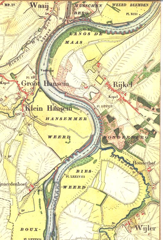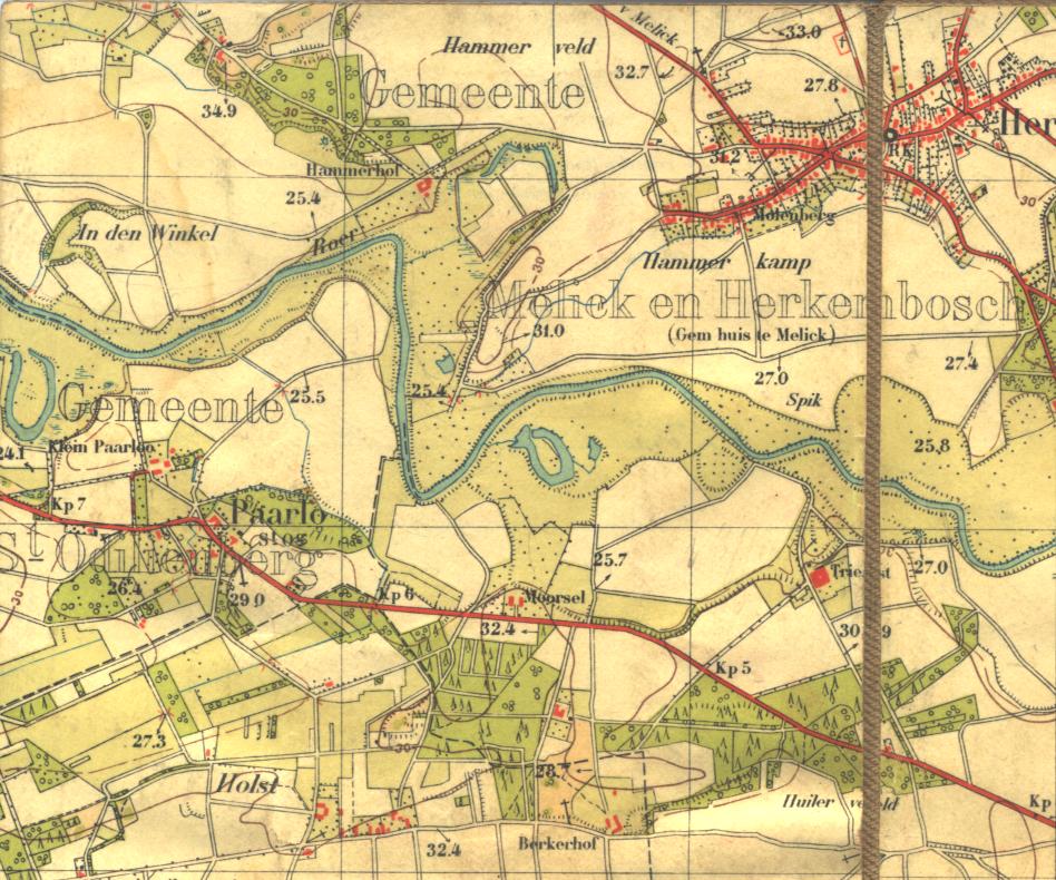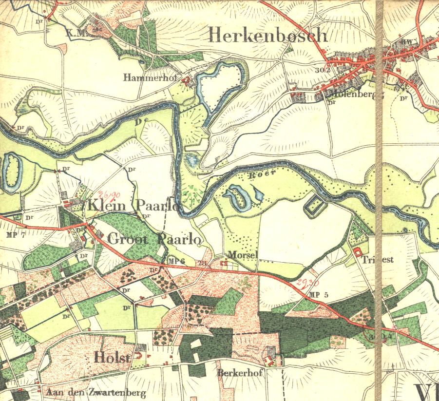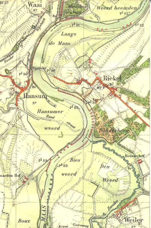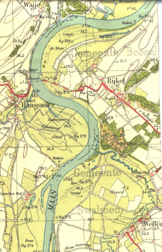 Vanaf eind jaren twintig is de oude manier van kaarten maken - de klassieke lithografie (steendruk) - geleidelijk verdrongen door modernere werkwijzen. Men begon o.a. met het fotografisch herdrukken van oude exemplaren wat leidde tot mindere kwaliteit en een veel hardere kleurstelling. Modernisering heeft niet steeds bijgedragen aan de schoonheid van de kaart. Maar dat is ook een kwestie van smaak….. hieronder eenzelfde klein stukje Nederland op drie verschillende kaarten uit, van links naar rechts, 1891, 1919 (gedrukt in 1927) en 1934 (gedrukt in 1938). Het gaat om kaart nummer 739 Buggenum, Limburg: de Donderberg, de plek waar de Swalm in de Maas stroomt. (Klik op de kaart voor een scherpere weergave!) Bij de kleuren valt met name het verschil in groen op voor de bossen en de weilanden. Ook het blauw voor water geeft de kaarten een ander aanzien. In de jaren 20 vinden we een zachtere kleurstelling. De kaarten van de jaren 30 vind ik persoonlijk minder mooi. Dat komt omdat men toen veel fotolitho’s is gaan maken. De verschillende kleuren groen die dat opleverde, doet soms pijn aan de ogen. Er zijn veel meer verschillen tussen de kaartjes. De kaart van 1891 heeft nog geen coördinatenstelsel, die van 1919 wel. De Romeinse getallen bij de rivierkilometerpalen LXXXVIII en LXXXIX zijn in 1919 vervangen door 88 en 89. Op de kaart van 1934 staan de hoogtes vermeld en worden er hoogtelijnen getekend. Op de kaarten van 1891 en 1919 wordt het landschapsprofiel met arceringen duidelijk gemaakt. Op de kaart van 1934 staan ook de hoekpalen (Hp) van de driehoeksmeting langs de grote rivieren ingetekend. Daarnaast valt het op dat zoveel namen op de verschillende kaarten anders worden geschreven. De scheidslijnen die ik trek tussen de verschillende jaartallen zijn niet zo scherp. Ik heb de indruk dat er vaak meerdere technieken en stijlen door elkaar gebruikt werden. Er zijn soms verschillen tussen kaarten uit hetzelfde jaar. Hieronder het verschil tussen een kaart uit 1890 en een uit 1936.